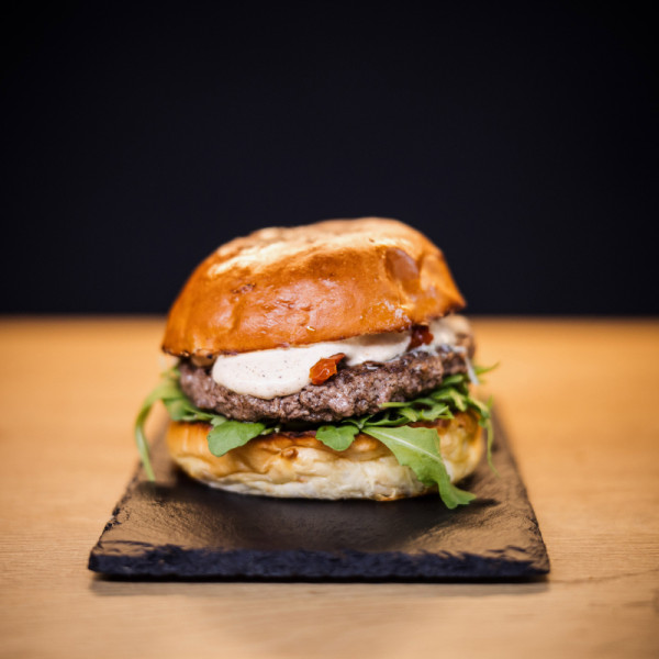 150g/300g maso, modrý sýr, rajčatový relish, rukola, sušená rajčata, Bejkn omáčka + příloha + omáčka + nápoj