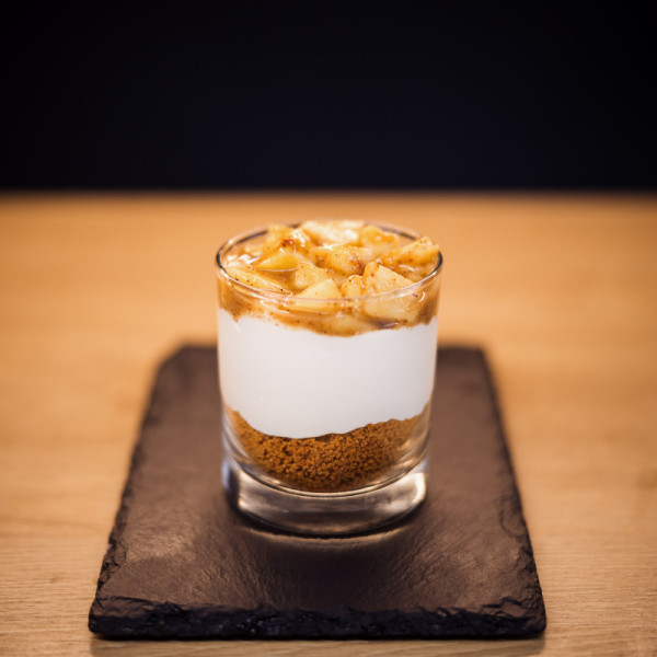 sušenkový crumble, krém z měkkého sýra, karamelizovaná jablka, skořice