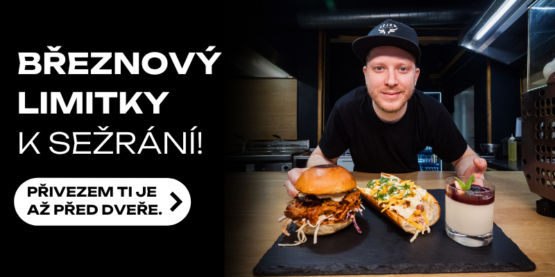 150g/300g maso, dvojitá porce slaniny a cheddaru, syrová červená cibule, salát, náš kečup, Bejkn omáčka + příloha + omáčka + nápoj