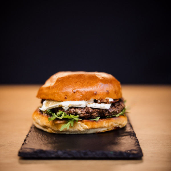 150g/300g maso, dýňové pyré, rukola, sýr Brie, slanina, cibulová majonéza + příloha + omáčka + nápoj